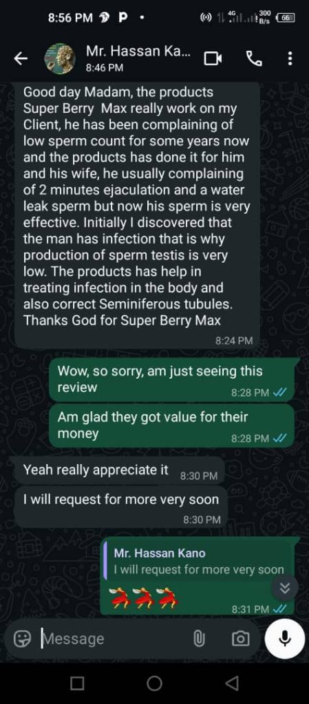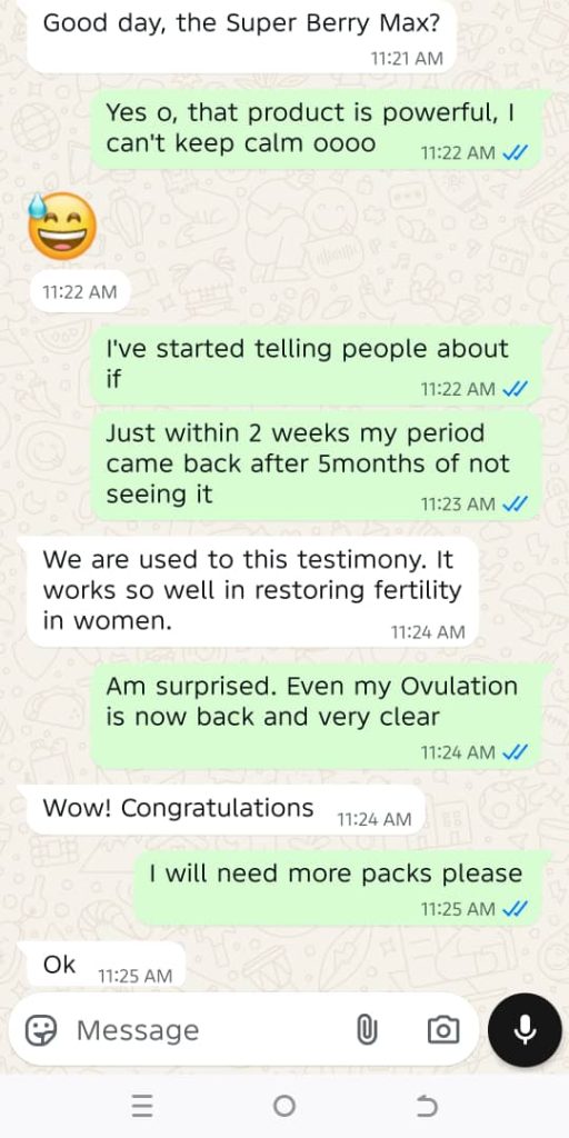 “I have been having issues in my Marriage prior to my experience with BerryMax,my husband has been unable to perform well for years now and we got to know he had serious infections that led to his sexual inactivity,Few months into taking BerryMax,my husband came out brand new and can fire anytime,anyday just the way i like”